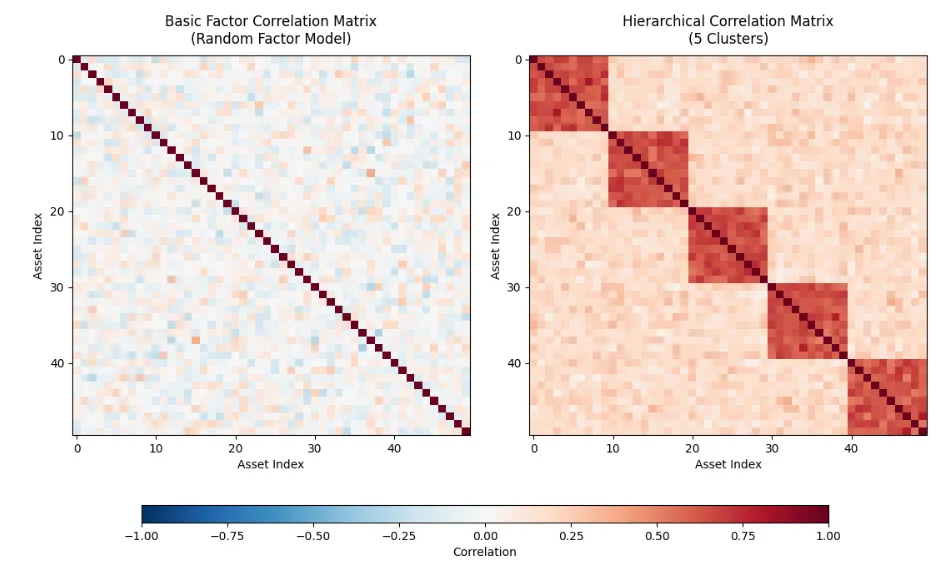 # ..# visualization.py# ..# Set random seed for reproducibilitynp.random.seed(42)# Parametersn = 50 # Size of correlation matricesn_clusters = 5 # Number of clusters for hierarchical generator# Generate correlation matricesbasic_generator = BasicFactorCorrelationMatrixGenerator(n=n)basic_matrix = basic_generator.generate()hierarchical_generator = HierarchicalCorrelationMatrixGenerator(n=n,n_clusters=n_clusters,intra_cluster_corr=0.7,inter_cluster_corr=0.2,noise_level=0.1)hierarchical_matrix = hierarchical_generator.generate()
