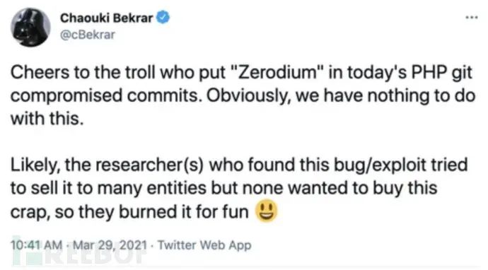 此外,恶意代码中包含了一条注解 “REMOVETHIS: sold to zerodium, mid 2017”。值得注意的是,Zerodium是一家知名的零日漏洞经纪商,而注释的意思是“漏洞在2017年中出售给了zerodium”。对此,而Zerodium的CEO Chaouki Bekrar认为攻击者很可能试图出售这个漏洞,但找不到卖家,所以攻击者干脆自己恶搞。