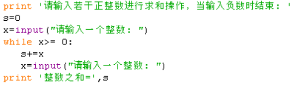 【示例4】编程从键盘输入若干正整数,求所有输入整数之和。当输入整数为负数时,结束该操作。