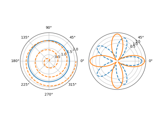 # rgrids()设置同心圆栅格的半径大小和文字标注的角度,因此右图中的虚线圆圈有三个,半径分别为0.5、1.0和1.5,这些文字沿着45°线排列
