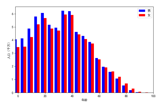 plt.bar(data[:,0]-width, data[:,1]/1e7, width, color="b", label=u"男")