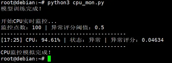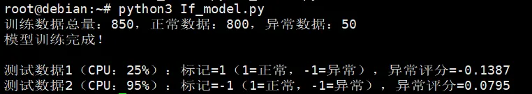 类封装:将检测器封装为LinuxMonitorAnomalyDetector,方便后续复用和扩展(可添加内存、磁盘等多指标检测)。标准化处理:使用StandardScaler消除数据量纲影响,避免因指标范围差异导致模型精度下降。contamination:异常数据比例,运维场景建议设为0.01-0.1,可根据实际监控数据调整。n_jobs=-1:利用Linux服务器多核特性,提升训练和预测速度。decision_function:计算异常评分,sklearn返回负值,转换为正数后更易理解(值越大,异常概率越高)。下面模拟Linux服务器24小时CPU使用率实时监控场景,包含:import numpy as npfrom sklearn.ensemble import IsolationForestfrom sklearn.preprocessing import StandardScalerimport timeclass LinuxCPUAnomalyDetector: def __init__(self, contamination=0.06, random_state=42): self.scaler = StandardScaler() self.model = IsolationForest( n_estimators=100, contamination=contamination, random_state=random_state, n_jobs=-1 ) self.is_trained = False def train(self, data): X = np.array(data).reshape(-1, 1) X_scaled = self.scaler.fit_transform(X) self.model.fit(X_scaled) self.is_trained = True print("模型训练完成!") def predict(self, data): if not self.is_trained: raise ValueError("模型未训练,请先调用train()方法") X = np.array(data).reshape(-1, 1) X_scaled = self.scaler.transform(X) labels = self.model.predict(X_scaled) scores = -self.model.decision_function(X_scaled) return labels[0] == -1, scores[0] # 直接返回是否异常+异常评分def simulate_cpu_monitor(): # 1. 准备训练数据并训练模型 normal_cpu = np.random.uniform(10, 30, 800).tolist() abnormal_cpu = np.random.uniform(80, 100, 50).tolist() train_data = normal_cpu + abnormal_cpu detector = LinuxCPUAnomalyDetector() detector.train(train_data) # 2. 简化模拟实时监控(缩减监控点数,保留核心逻辑) monitor_count = 100 # 简化监控次数,无需2880个点 alert_score = 0.5 anomaly_count = 0 print("\n开始CPU实时监控...") print(f"监控点数:{monitor_count} | 异常评分阈值:{alert_score}") print("-" * 40) for i in range(monitor_count): # 模拟监控时间 monitor_time = time.strftime("%H:%M", time.localtime(time.time() + i * 30)) # 前70个正常,后30个异常 current_cpu = np.random.uniform(10, 30) if i < 70 else np.random.uniform(80, 100) # 预测异常 is_anomaly, anomaly_score = detector.predict([current_cpu]) # 打印监控信息 status = "异常" if is_anomaly else "正常" print(f"[{monitor_time}] CPU:{current_cpu:.2f}% | 状态:{status} | 异常评分:{anomaly_score:.4f}", end="\r") time.sleep(0.01) # 简化告警计数逻辑(无邮件,仅标记连续异常) if is_anomaly and anomaly_score >= alert_score: anomaly_count += 1 if anomaly_count >= 3: print(f"\n【告警】[{monitor_time}] CPU异常飙升:{current_cpu:.2f}%") anomaly_count = 0 else: anomaly_count = 0 print("\n" + "-" * 40) print("CPU监控模拟完成!")if __name__ == "__main__": simulate_cpu_monitor()