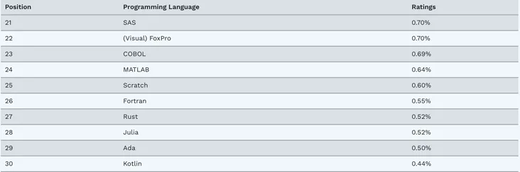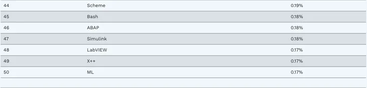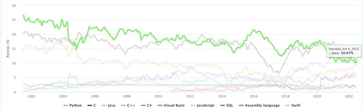 近年来 Python 编程语言热度一路上涨,相比去年 6 月,此前榜单第 2 的 Python 如今已经来到了第 1 名的位置,与此前排名第位的 C 位置发生了互换。而本月排在第 3 位的 Java 则“岌岌可危”,数据下降了 1.07%,几乎要被排在第 4 位的 C++(评级为 9.63%,评分上涨+2.26%)超越。排在榜单第 5-10 位的分别为:C#(评级为 6.12%,评分上涨+1.79%)、Visual Basic(评级为 5.42%,评分上涨+1.40%)、JavaScript(评级为2.09% ,评价下降-0.24%)、SQL(评分为 1.94%,评分下降+0.06%)、Assembly language(评级为 1.85%、评分下降-0.21%)、Swift(评级为 1.55%,评分上涨+0.44%)。其中,排名第 5、6、7 、9 位的 C#、Visual Basic、JavaScript 及Assembly language 这四种编程语言同比去年位置并无变化。变化较大的是去年排名榜单第 10 位的 SQL,本次评分上涨了+0.06%,且排位也来到了第 8 名;去年榜单第 16 位的 Swift 本期评分上涨+0.44%,排名也进入了前 10 。几十年来,SQL 编程语言仍被普遍使用且热度不减,或许与该语言“与时俱进”的适应性标准相关,近年来 SQL 标准一直在随时间进行调整,并吸收来自用户的反馈,特别是 API 的使用让 SQL 得以使用特定句法来持续适应新时代。而作为 Apple 新推出的编程语言,排名变化最大的 Swift 热度近期迅速上升,这其中的原因离不开其高级结构、闭包、泛型等特点优势,特别对于开发者而言,Swift 是在 Objective-C 之外的第二种选择,便捷程度大增。此外,本次榜单排名第 11- 20 位的编程语言分别为:Classic Visual Basic (1.33%,-0.40%)、Delphi/Object Pascal(1.32% ,+0.26%)、PHP(1.25%,-0.97%)、Objective-C( 1.02%,+0.33%)、Go(1.02% ,+0.07%)、R(0.98%,-0.22%)、Perl(0.76%,-0.41%)、Lua(0.76%,+0.43%)、Ruby(0.75%,-0.48%)、Prolog(0.74%, +0.18%)。其中,排名下降较大的分别为 PHP、R 以及 Perl。尽管在生产场景下依然有大量的应用,市场存量非常大,但依旧挡不住 PHP 的颓势,近年来热度一路下跌,已跌出了榜单前十。TIOBE 榜单编程语言趋势走向图(2002-2022):从以上趋势图可以清楚的看到各种编程语言在这 20 年的过程中的热度及变化,其中最明显下滑的曲线之一就是 Java。本期榜单排名第 51-100的编程语言,由于差异相对较小,因此只列出了编程语言(按字母顺序):ABC、ActionScript、ATLAS、BBC BASIC、bc、BlitzMax、Bourne shell、CFML、Chapel、CL(OS/400)、Clipper、CLIPS、Eiffel、Erlang、EXEC、F#、Forth、Hack、Haxe、Icon、IDL、J#、Ladder Logic、LiveCode、Logo、LPC、Lustre、MDX、MQL4、MUMPS、NATURAL、Nim、Oberon、OCaml、OpenEdge ABL、PostScript、Q、Racket、Raku、REXX、Ring、RPG、Snap!,SPARK、Stata、Tcl、Vala/Genie、VHDL、X10、Xojo。TIOBE 编程社区指数是编程语言流行程度的一个指标,索引每月更新一次。评分基于全球熟练工程师的数量、课程和第三方供应商及流行的搜索引擎如 Google、Bing、Yahoo!、维基百科、亚马逊、YouTube 和百度。需要注意的是,TIOBE 索引榜单结果并不是最好的编程语言的榜单,也不是关于编写了大多数代码行的语言。参考链接:https://www.tiobe.com/tiobe-index/