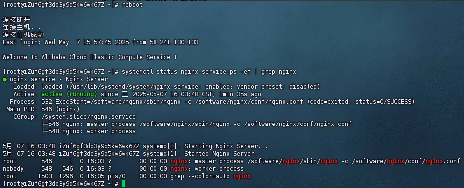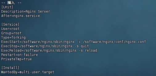 [Unit]Description=Nginx ServerAfter=nginx.service[Service]User=rootGroup=rootType=forkingExecStart=/software/nginx/sbin/nginx -c /software/nginx/conf/nginx.confExecStop=/software/nginx/sbin/nginx -s quitExecReload=/software/nginx/sbin/nginx -s reloadRestart=on-failurePrivateTmp=true[Install]WantedBy=multi-user.target