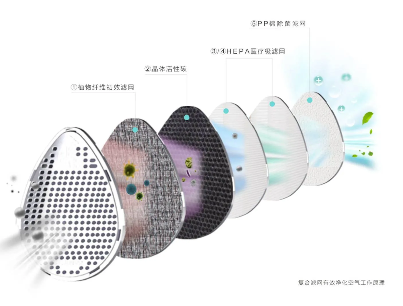 滤芯共有5层。前两层来自天然植物纤维、东南亚椰壳烧制的晶体活性炭,后两层是HEPA医疗级的滤芯和专业除菌的PP棉。层层过滤毛发、粉尘、甲醛、PM2.5、游离的病菌。。