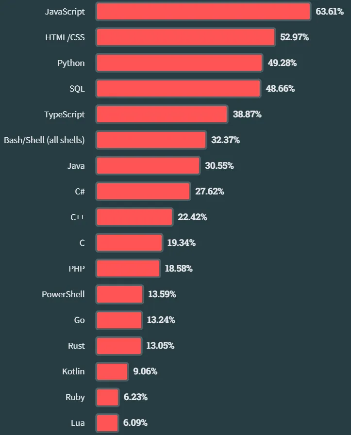 Go 和 Rust 的使用情况占比与去年相比也有了一定的上升。