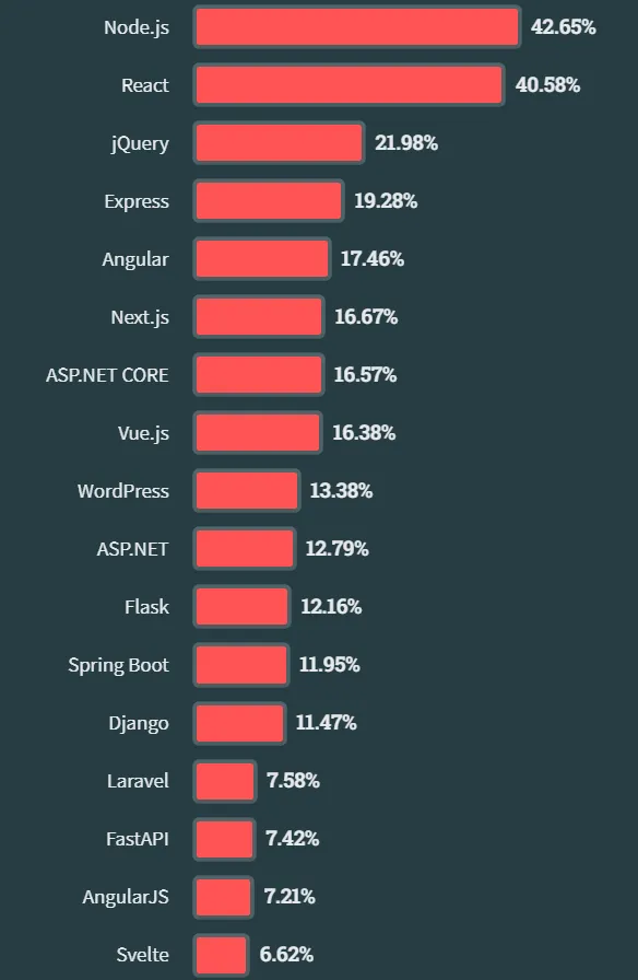 其他较受欢迎的还包括 jQuery、Express、Angular、Next.js 和 Vue.js。