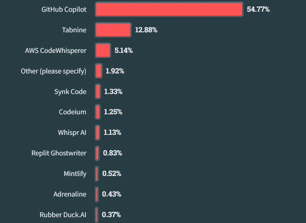 GitHub Copilot 是最受欢迎的 AI 开发工具,被  55% 的受访者使用,其次是 Tabnine (13%) 和 AWS CodeWhisperer (5%)。