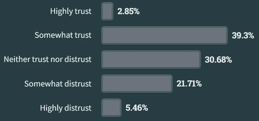 在使用或计划使用 AI 工具的人中,只有不到 3% 高度信任它们的准确性,而有两倍多的人(大约 6%)非常不信任。此外有 39% 的人对 AI 工具表示有些信任,30% 则表示没有所谓信不信任。