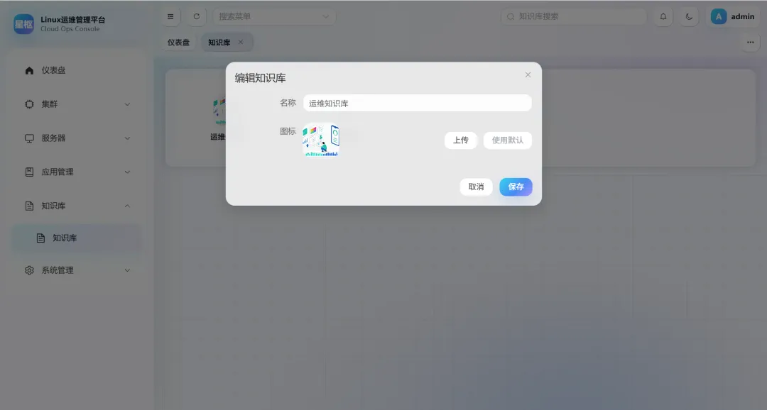 - • 编辑知识库:点击卡片右上角“编辑”按钮,支持修改名称和图标,保存后实时同步列表。