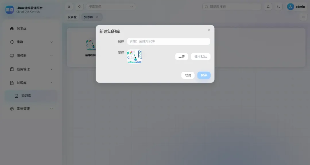 - • 新建知识库:弹窗填写「名称+图标(可选)」,创建成功后自动刷新卡片列表;