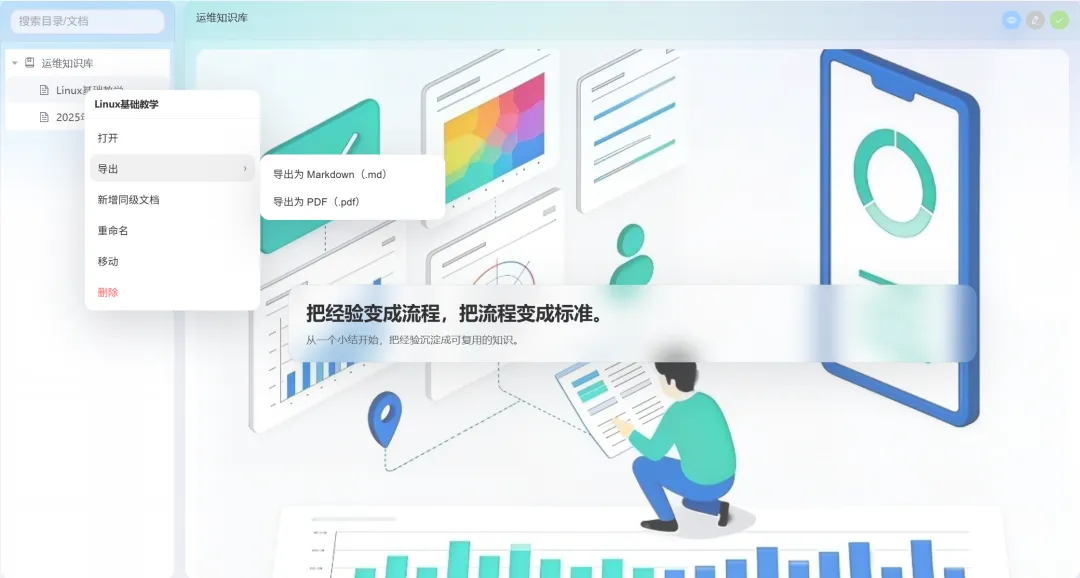 - • 文档节点右键:打开、导出(悬浮子菜单:md/pdf)、新增同级文档、重命名、移动、删除;
