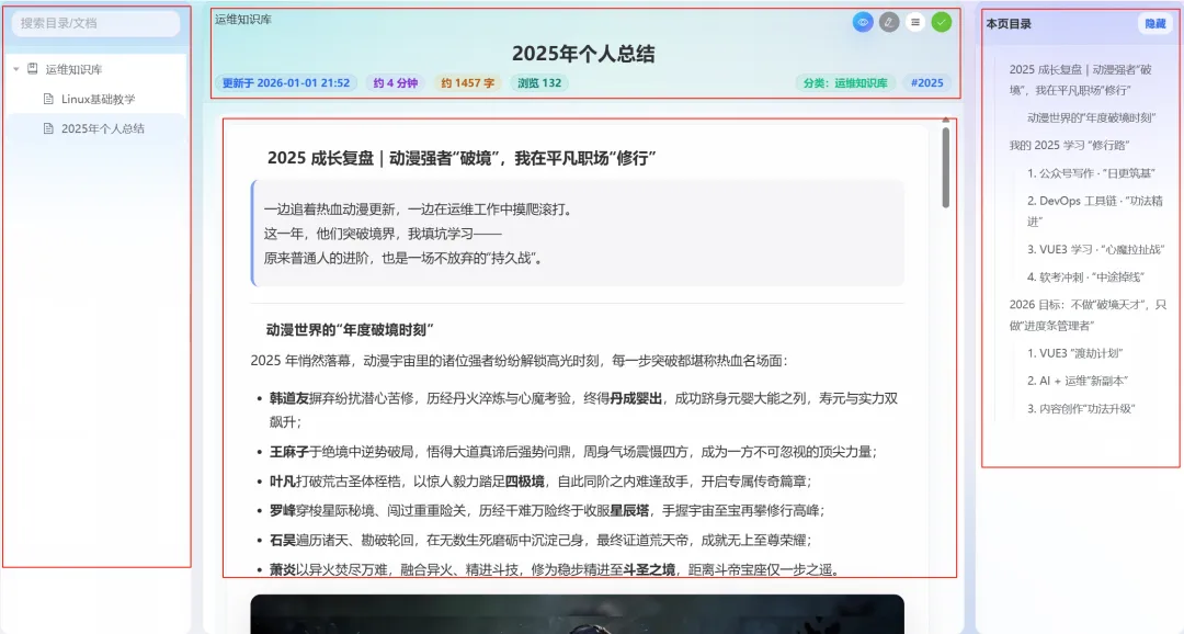 采用运维人员熟悉的VuePress三栏布局(左侧目录树 / 中间正文编辑区 / 右侧本页目录),符合日常文档编辑习惯,同时具备完整的增、删、改、查基础功能,让文档管理更高效。