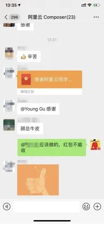 此次国际网络不稳定导致的镜像问题,阿里工程师顾咏第一时间响应了PHPer的诉求,连夜排查问题。 “我们程序员都离不开这个,越早解决越好”,最后终于成功定位问题、完成系统更新,解决了大家的燃眉之急。群里的开发者主动发红包向其致谢,顾咏十分感动,然后拒绝了他:“应该做的,红包不能收。”