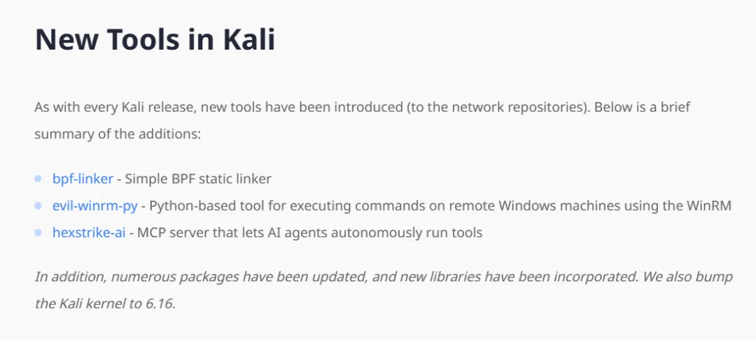 这次发布的 Kali Linux 2025.4 (Kali Linux 2025.3 正式发布!砍掉老旧架构,性能与兼容性双提升,向最贴近前沿的专业安全平台进化)是一个成熟度更高、细节打磨更完善的版本,在桌面体验、Wayland 支持、工具更新和镜像分发方式等方面均有显著提升,内核版本也升到了 Linux Kernel 6.16。