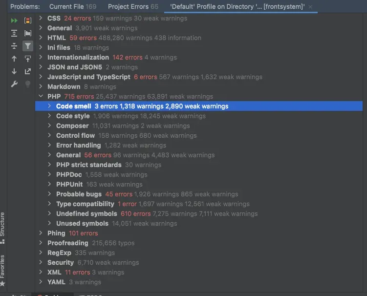 代码复杂度分布图使用静态分析代码整体的项目后的 PHP 错误数高达715处,警告数达到25000+,说明了历史代码的存在诸多问题。