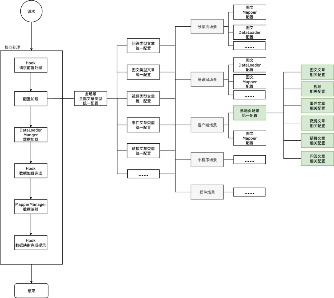 根据请求场景,文章类型加载配置,实现根据不同需求返回不同数据响应,实现差异化配置,分为四层配置体系:
