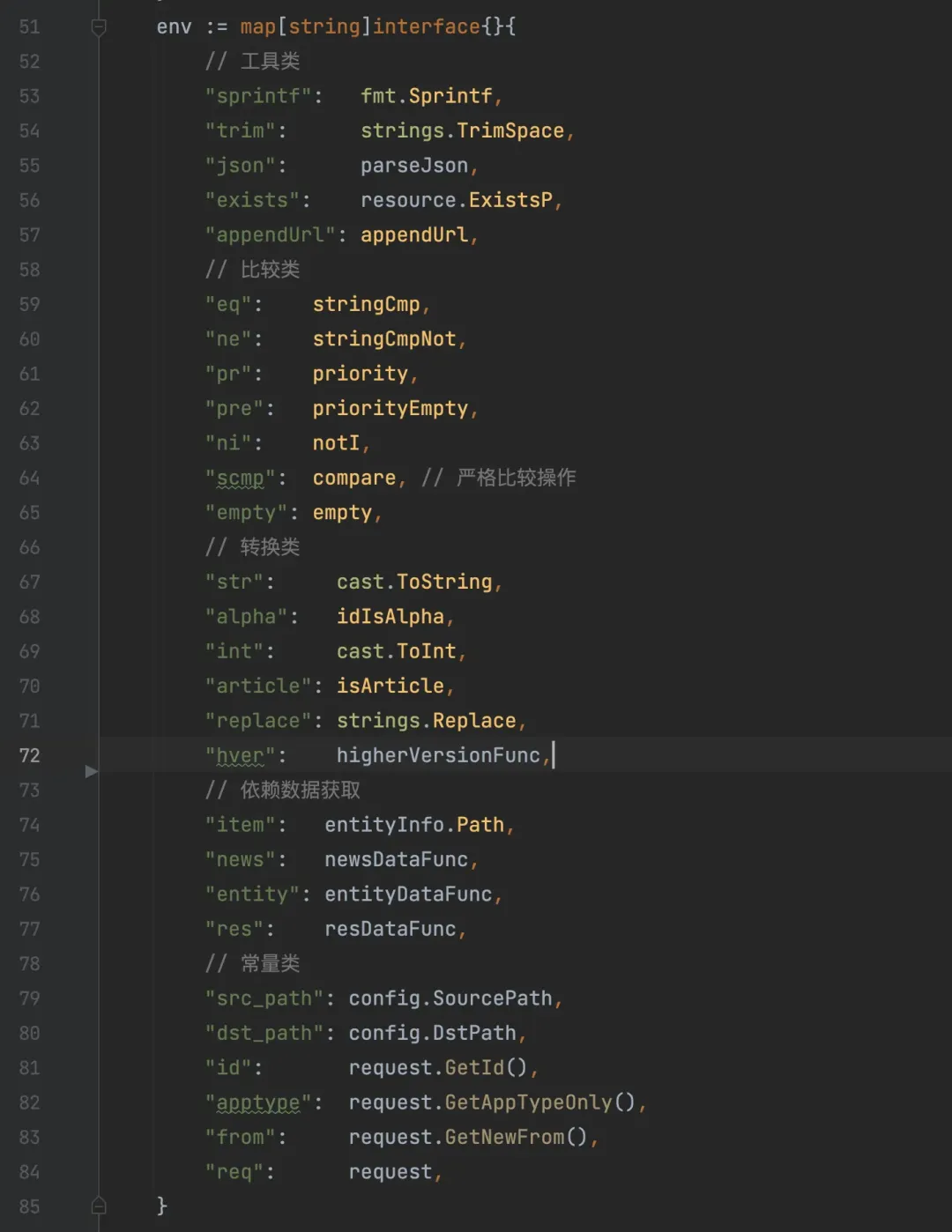 底层页基于 expr 库实现定制化函数、其中包括比较类、转换类、工具类、数据类、常量类: