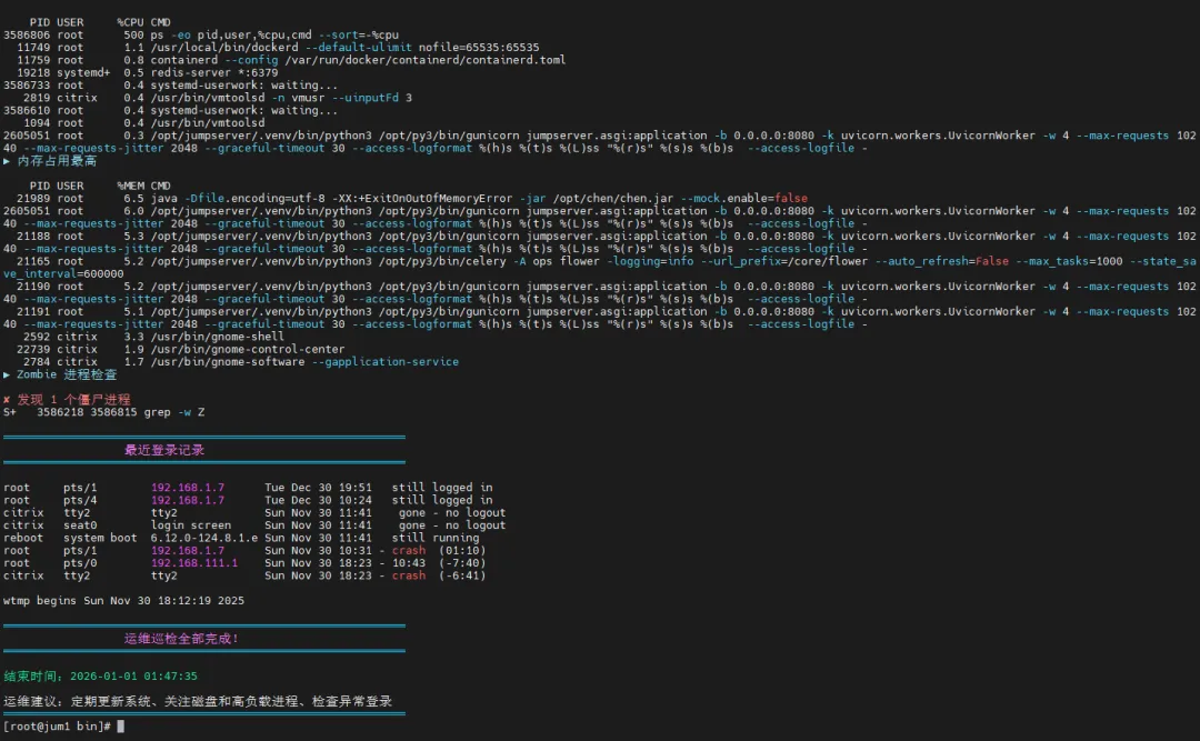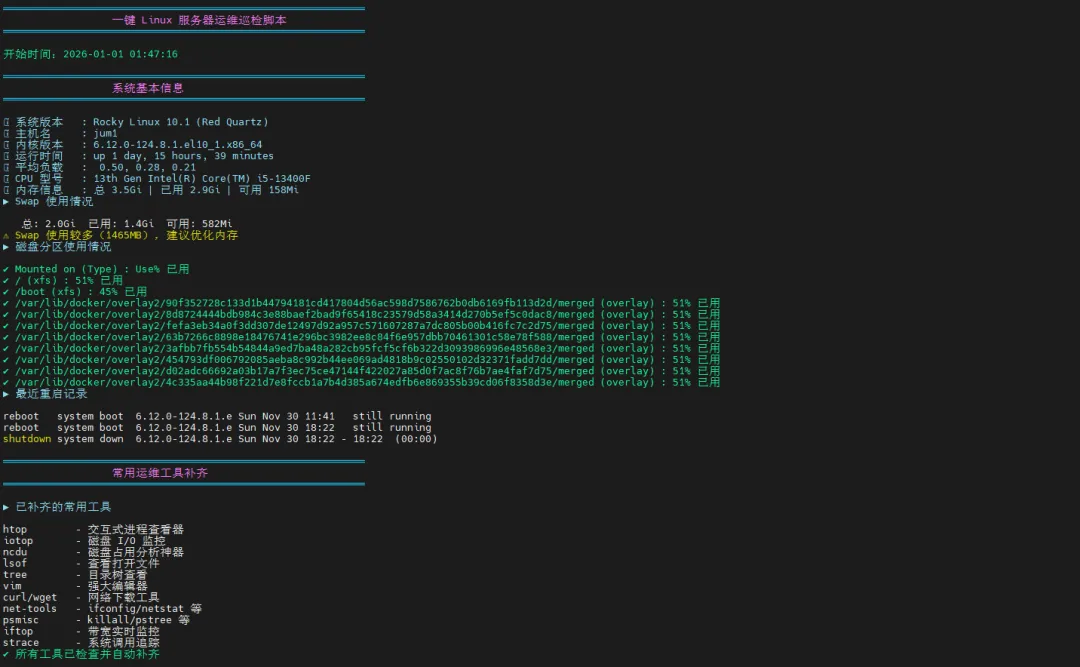 这是一款专为日常运维设计的轻量级巡检工具,一键运行即可快速检查服务器健康状态,包括: