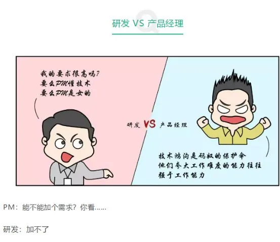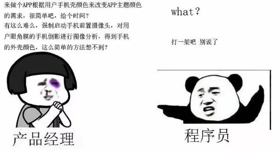 前一阵,网络疯传一组“程序员干架产品经理”,只因“据称某互联网公司产品经理提了个要求,要求APP开发人员可以做到根据用户的手机壳来改变软件主题颜色,然后就干起来了”。事后虽然辟谣说是“个人矛盾”,但产品经理的“我的需求你怎么就不理解”,开发人员的“我的开发难度怎么你就不懂”成为一对难解难分的“永恒矛盾”。