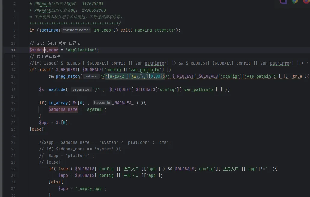 这和system的目录结构也对应上了,回到代码,如果$_REQUEST[$GLOBALS['config']['var_pathinfo']] 不存在,也就是对应的路由请求不符合规则就会触发23-36行的else,这个我们先不管