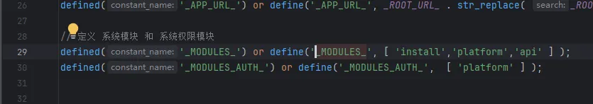 38-40判断请求路由拼接的方法目录是否存在,43-50定义应用相关常量:设置插件目录名、模块名、模块绝对路径和URL路径四个常量,53-56检查指定模块的配置文件(manifest.php)是否存在,如果存在则加载该配置文件,并将其中的application配置项赋值给全局配置变量