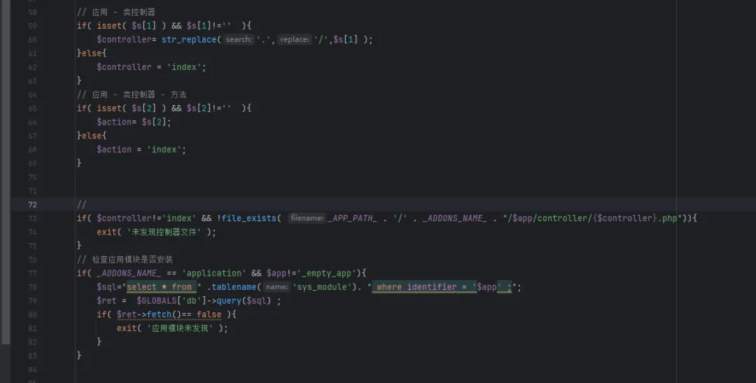 73-75检查控制器文件是否存在,77-82检查如果触发的是application下的模块的话通过数据库检查是否存在模块名,这里是直接拼接查询,但是前面的正则检查不能出现特殊字符