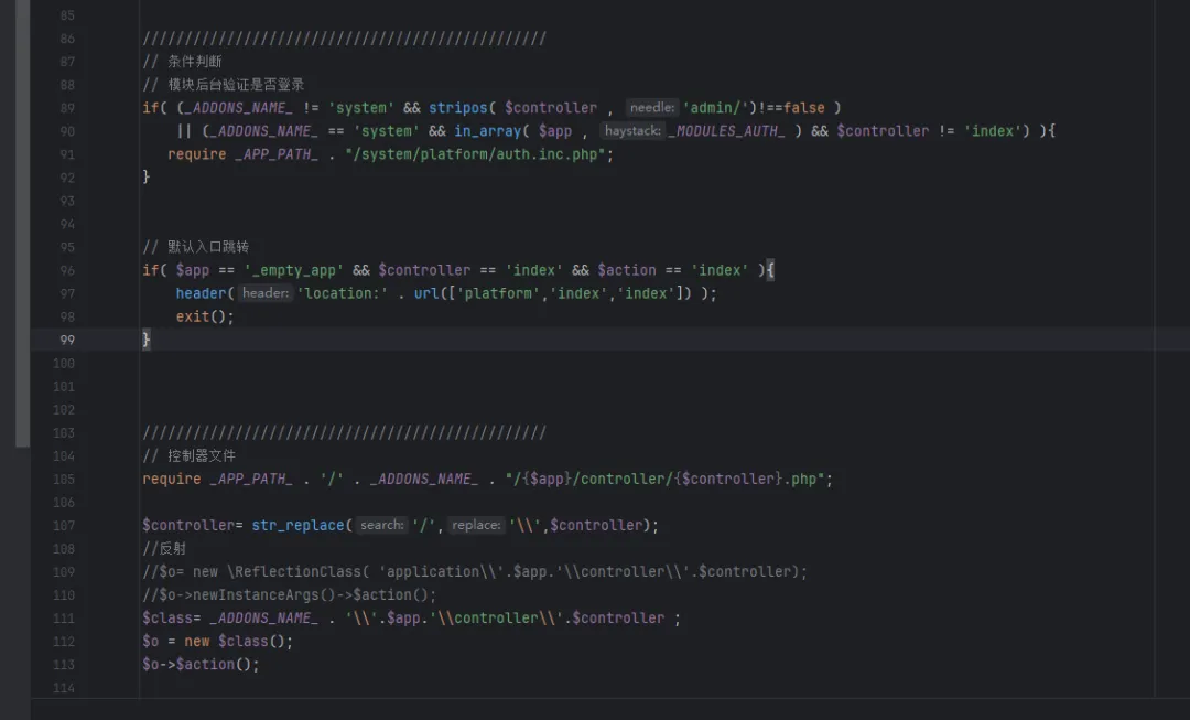 89-92是权限校验的一会鉴权分析再说明,96-99设置了默认入口,105行包含了要触发的控制器文件,然后在111行构造完整的类路径,112行实例化,113行调用对应的触发方法
