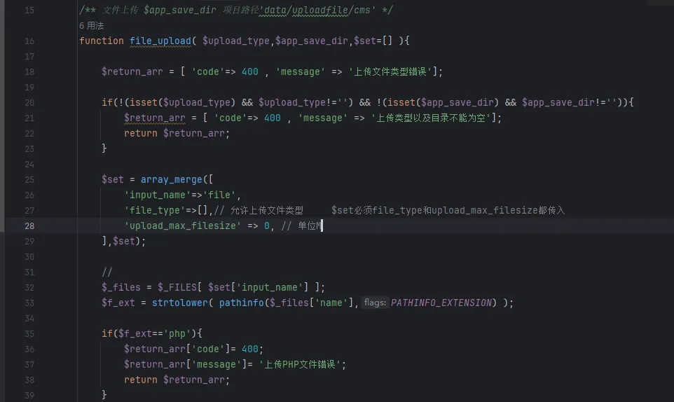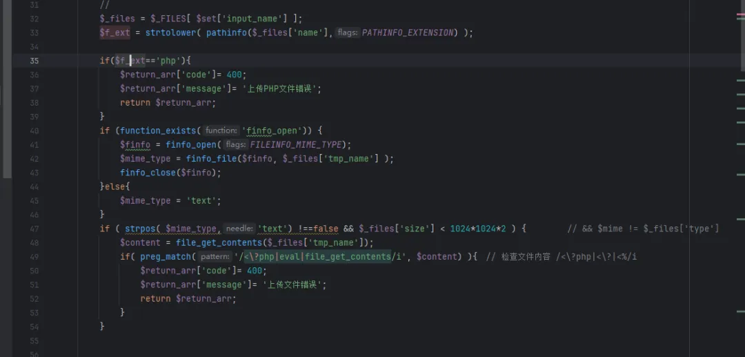 33行获取我们上传的文件后缀,35-39行一个黑名单逻辑判断,后缀不能为php,这个可以尝试phtml等变式后缀绕过,47-54行对文件内容进行检测,不能出现?php|eval|file_get_contents,函数多的去了,这里过滤?php可尝试采用短标签绕过