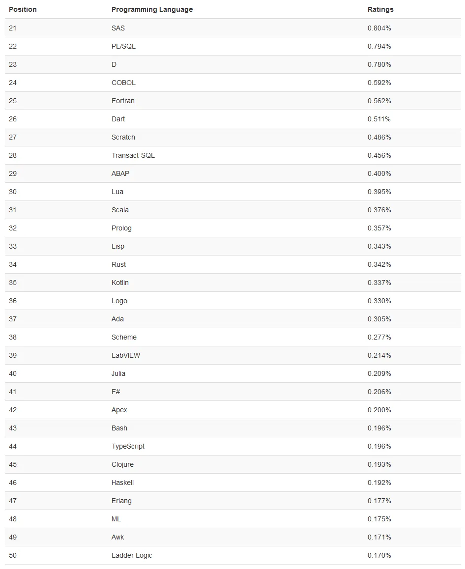 21-50 名的编程语言排行