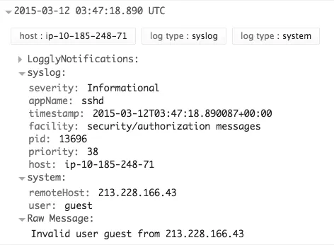 这里你可以看一个来自 sshd 的日志信息,解析出了远程主机和用户字段。这个截图来自 Loggly,一个基于云计算的日志管理服务。