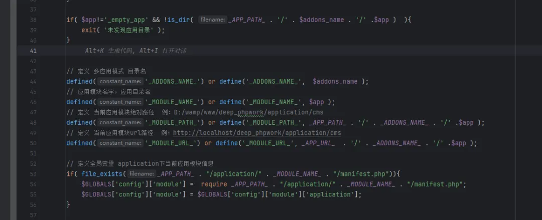 38-40判断请求路由拼接的方法目录是否存在,43-50定义应用相关常量:设置插件目录名、模块名、模块绝对路径和URL路径四个常量,53-56检查指定模块的配置文件(manifest.php)是否存在,如果存在则加载该配置文件,并将其中的application配置项赋值给全局配置变量