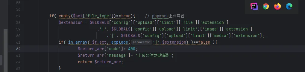 接着在57-65行发现了获取白名单后缀进行判断的操作$extension通过全局配置变量 $GLOBALS['config']['upload']['limit'] 中获取的,这里没找到定义,直接全局搜索extension