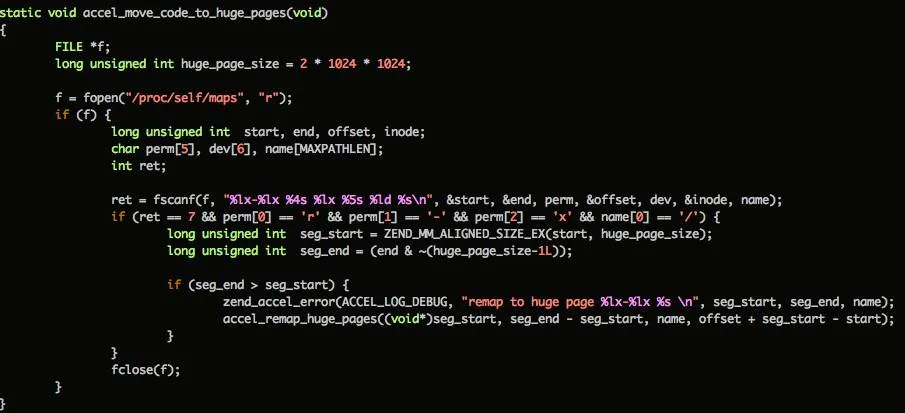 PHP7开启HugePage支持后,会把自身的text段, 以及内存分配中的huge都采用大内存页来保存, 减少TLB miss, 从而提高性能。相关实现可参考Opcache实现中的accel_move_code_to_huge_pages()函数。