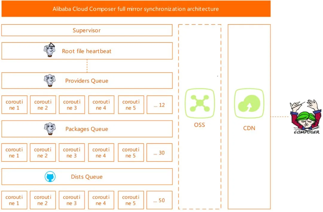 11月16日开始,由于 Composer 镜像出现了间歇性无法访问情况,不少网友通过阿里云钉钉服务群反应阿里云镜像出现不可用的情况,主要 zlib_decode 和 404 错误。在测试其他镜像作对比时发现,其他镜像也存在此类情况。接到反馈后,我们第一时间进行问题排查:问题定位:阿里工程师立即查看系统状态和日志,未发现异常。初步怀疑是由于 CDN 接入层收国际网络延迟导致不可用。验证:阿里工程师笔将相同的数据回传至国内 Bucket ,在今经多次、多地域直接访问测试,均成功。决心升级:以往偶尔遇到这种问题,都被当做正常现象对待,而此次持续时间较长,影响面广,为了彻底解决这类问题,阿里决定升级镜像系统部署方案,直接将最新数据传回国内。1)同步的数据不是 Packagist 的根数据。事实上,官方的根数据不对外公开,开发者平时所访问的数据是镜像,甚至是镜像的镜像。当客户端发起请求后,请求会被官方 DNS 指向其他的镜像站,这些镜像数据与根数据之间已经存在延迟。而由于国际网络或系统设计原因,曾经出现初次官方镜像站与根数据长达数小时不同步 的情况。2)没有处理代码包 dist。大多数依赖包的源代码存储在在github、gitlab上,因为网络问题,也会导致使用者下载速度慢,甚至下载失败。这也是镜像站需要关注处理的,一般镜像只提供 meta 数据(包数据)。例如官方推荐的 Webysther's mirror code 镜像同步系统就不处理dist。3)本地文件存储。目前已知的其他镜像系统,是将文件存储在本地,或至少先存储在本地再上传,这样不仅会消耗大量本地磁盘空间,还存在系统最大子目录限制,会使得系统存在致命瓶颈。优化版本使用的软连接方案也会随着包的无限增长需要重构。4)单进程,性能表现不佳,消耗 CPU、内存资源大。且处理数据耗时长,更新速度慢,系统的设计导致任务不能分发,且同步时间间隔越长,同步的时间越常。5)没有数据错误统计,官方源数据存在错误,也需要直观的展示,让开发者了解情况。6)系统同步状态、数据不可视化,镜像是否已更新?什么时候更新?今天更新了多少?下一次什么时候更新?这些数据开发者都不知道。阿里云镜像的架构核心目标是实时、快读、稳定、可移植、可扩展,且具备对数据进行自我修复的能力。那么阿里云镜像和其他镜像有什么区别?阿里云镜像又是如何做到秒级同步的呢?在数据上,阿里云与 Packagist 官方合作,经过和 Packagist 沟通,阿里云在距离官方根数据最近的城市节点部署了服务器,同时阿里云的服务器 IP地址 被加入 Packagist 白名单,允许直接、频繁地访问其根数据(Meta)。获取和解析 Meta 后,系统从代码仓库中下载源代码压缩包,再通过阿里云洛神网络不限带宽的将数据传回国内,这从最大程度上保证了国内用户可以及时、快速地获取最新数据。开发者使用 Composer 安装依赖的数据,都是镜像,甚至是镜像的镜像。例如官方在新加坡的镜像,就数次出现长达数小时的不更新,以此为镜像源的镜像站就无法为开发者提供正常的服务。阿里云实时同步源数据,对于以下场景的用户具有十分重要的意义:1. 迫切需要更新补丁依赖包的使用者。当一个依赖包被发现有bug,得到修复后使用者往往需要第一时间升级更新,镜像同步的越及时、服务越稳定,使用者的补丁修复的也就越早,止损也就更及时。2. 检查依赖包发布状态的包开发者来说。对于包的开发者,在发布包后,能尽快的检查发布状态,通过安装命令验证其作品的可用性。同步系统由阿里云自主研发,采用 Golang 编写,使用 Redis 做任务队列,心跳协程将更新的数据文件分发到任务队列,30个协程各自分工获取数据传回国内OSS。这意味着所要同步的数据不再是一个单进程按照顺序一个一个传输,而是多个协程,甚至是多台机上的多个协程一起分工,这又将同步时间大幅度缩短。在任务分发的机制上,实现了任务不重复,由于内存会记录已经成功处理过的任务和已分发的任务,所以不会分发旧文件,也不会发布相同的任务,这避免无效、重复工作,更是大幅度的减少了工作量,降低延迟。对于数据获取错误的情况,系统具有重试机制,对于因为网络问题暂时访问错误的源数据、代码包,系统会重试请求。阿里云 Composer 全量镜像,依靠阿里云强大的 OSS 存储源数据和代码压缩包,不占用本地磁盘,在避免最大子目录的问题的同时,还能轻松移植、扩展系统。记录和统计官方错误,阿里云将官方记录当中的一些错误记录下来,在方便内部随时排查问题的同时,也能更准确的了解 Packagist 的情况。处理不成功的任务不会被记录,在间隔时间极短的下一次同步中会得到修复。而执行错误的任务则会使用重试修复。如果需要人工修复,只需删除响应的 KEY,系统即可重新执行并更新状态。镜像数据对外,接入了阿里云全国 CDN 节点,阿里云强大的网络基础设施保证了开发者如丝般顺滑的使用体验。镜像系统数据状态可视,在阿里云 Composer 全量镜像的官方页面上,动态显示 Packagist 最后更新时间,阿里云同步耗时、下一次刷新 CDN 的时间,系统同步的状态和数据让开发者“心中有数”。阿里做镜像站的历史最早可追溯至2011年,从最开始阿里内部的需求,扩展到为更广大的开发者免费投入资源,提供更快、更稳定的镜像资源。从最初的几台设备,成长为现在覆盖主流语言和主流操作系统的全量镜像站。并且,在这个过程中,一直坚