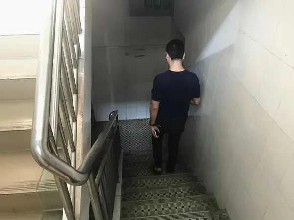 雷大同走在狭窄的出租屋楼道。 澎湃新闻记者 沈文迪 图