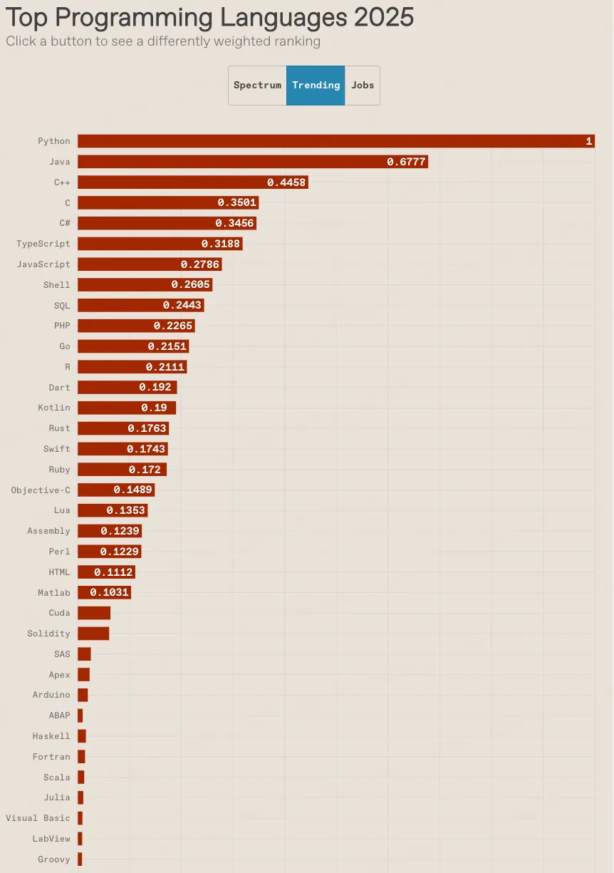 编程语言的世界从未如此格局分明。根据IEEE Spectrum发布的2025年度顶级编程语言榜单,Python的领先优势已呈现出“断崖式”的特征。