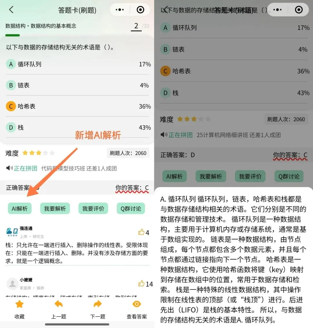 针对很多同学出现的代码题薄弱、计网琐碎知识点记不住的情况,强连通团队新增必背代码100题和计网填空背诵700题题库;新增随机出题、AI解析、错题自动收集功能。