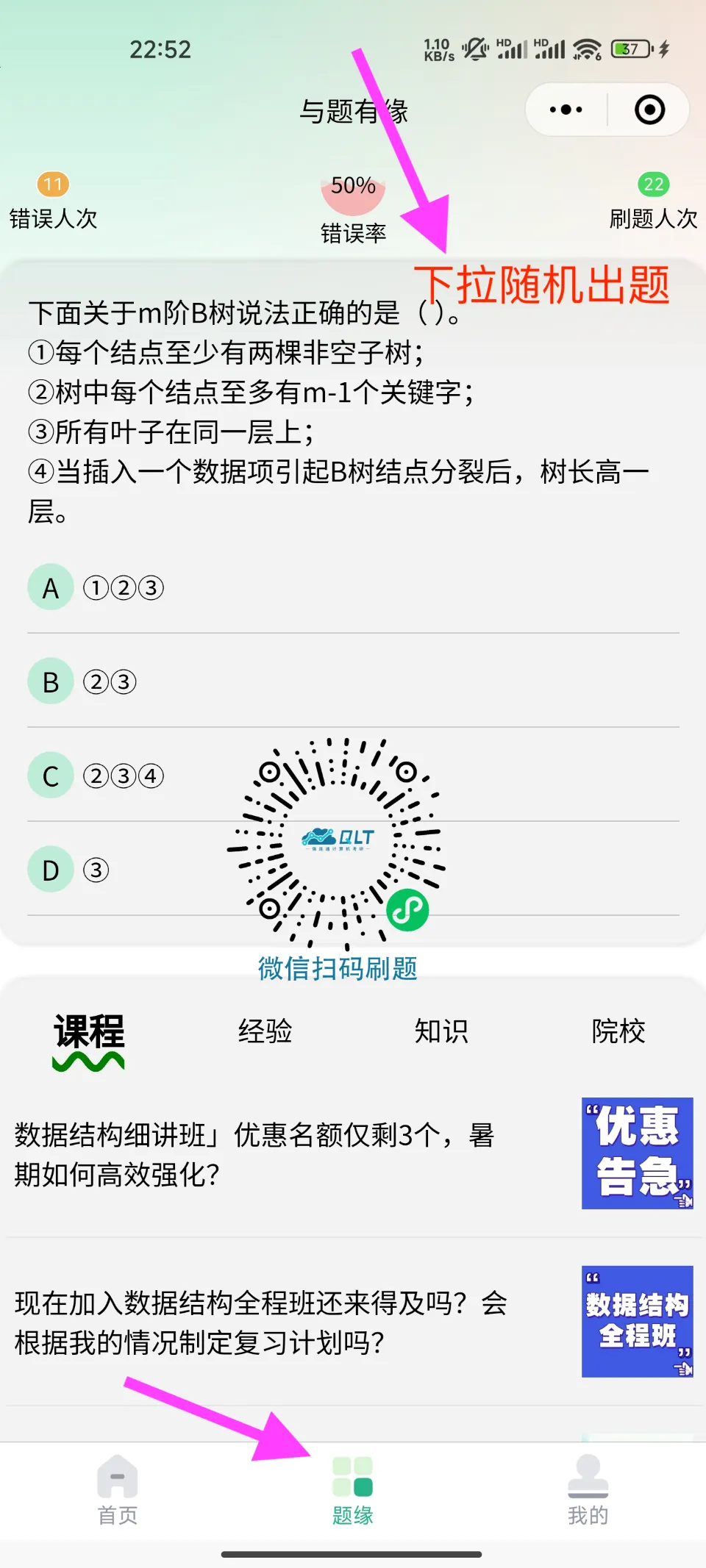 小程序“题缘”页面,下拉即可随机出题。任意刷,随时刷,检测学习成果。