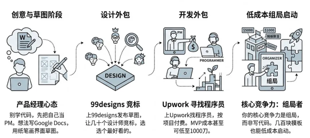 成本?他说,做一个 MVP ,只要不到 5000 刀,甚至 1000 刀就能搞定。如果是用现成的模板,几百块就能启动。你的核心竞争力不是写代码,而是组局。