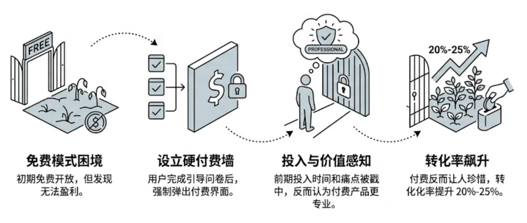 什么意思?用户下载 APP -> 开始引导流程,问你抽多少烟、烟龄多久 -> 啪!弹出一个付费界面。不付钱?不准进 APP。你可能会觉得:用户不都跑了吗?事实恰恰相反。转化率飙升了 20%-25%。为什么?因为前面的引导流程已经让用户投入了时间,而且痛点被戳中了。这时候让他付费,他反而觉得:这东西肯定很专业,买了就能戒烟。有时候,免费才是最贵的,付费反而让人珍惜。