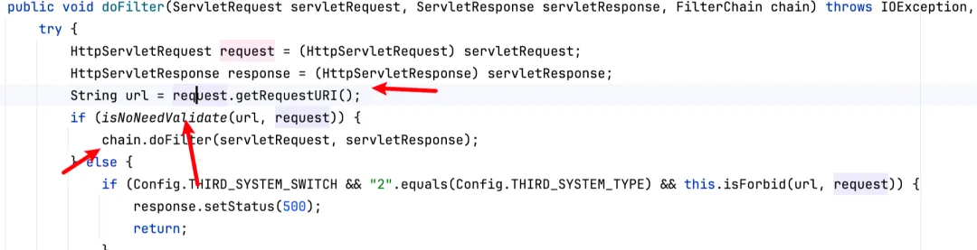 这里可以看到获取URL的方法是存在问题的,该方法在配合Tomcat中间件时候可以通过特殊字符进行绕过对应鉴权。