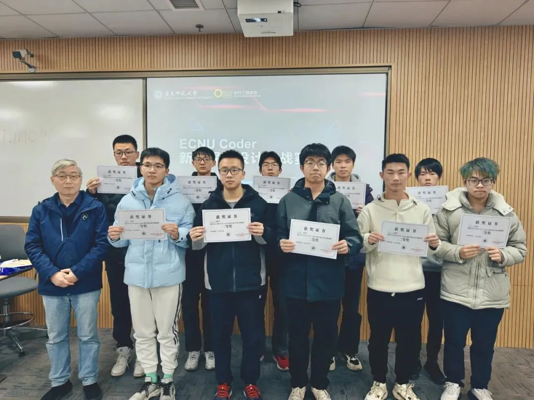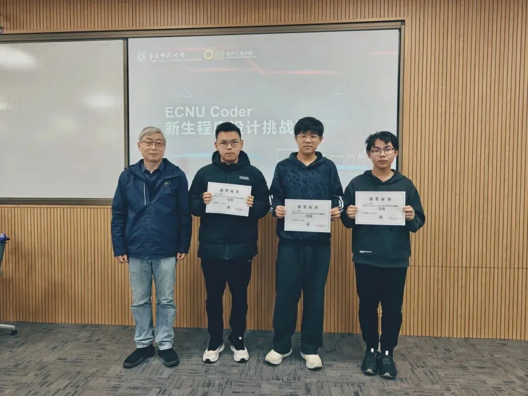 12月28日,2025新生编程大赛在华东师范大学普陀校区火热开启。本次大赛吸引了几十名校内新生现场竞技,更有百余位校外选手云端同步切磋。在4个小时的极限时间内,选手们单兵作战,直面算法世界的重重挑战。经过激烈角逐,刘溢,黄启轩,高天宇三位同学凭借扎实的代码能力,以极高的通过率脱颖而出,荣获一等奖。